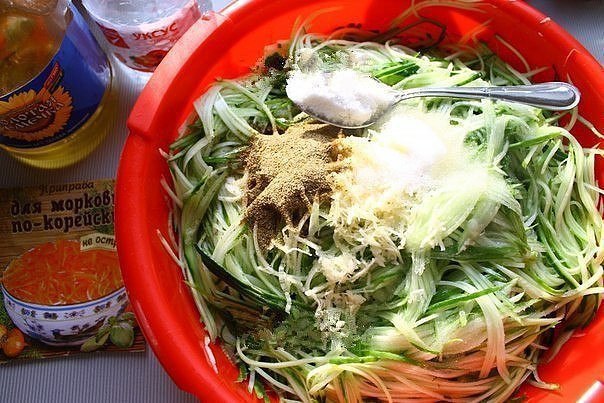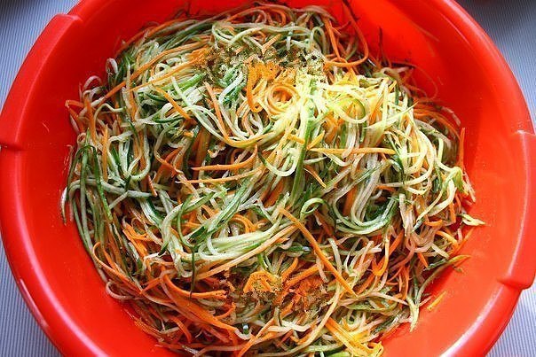 Если у вас переросли огурцы - не беда - из них можно сделать очень вкусный салат на зиму! Слишком желтые, конечно, лучше не брать, а остальные смело "пускайте в ход". Очень часто встречала подобный рецепт заготовки: и все они в основном отличаются нарезкой овощей. Мне понравился вот такой, где огурцы и морковь нарезаются длинной, тонкой соломкой - "по-корейски". Можно использовать специальную терку для нарезки "моркови по-корейски", или хороший и острый нож или специальную двустороннюю овощечистку, кстати, очень хорошая и полезная вещь!Готовится такой салтик очень просто, а результат просто превосходный - уже продегустировали - вы можете его подать в качестве закуски на праздничный или обеденный стол, да и так, когда захочется похрустеть чем-нибудь остреньким!